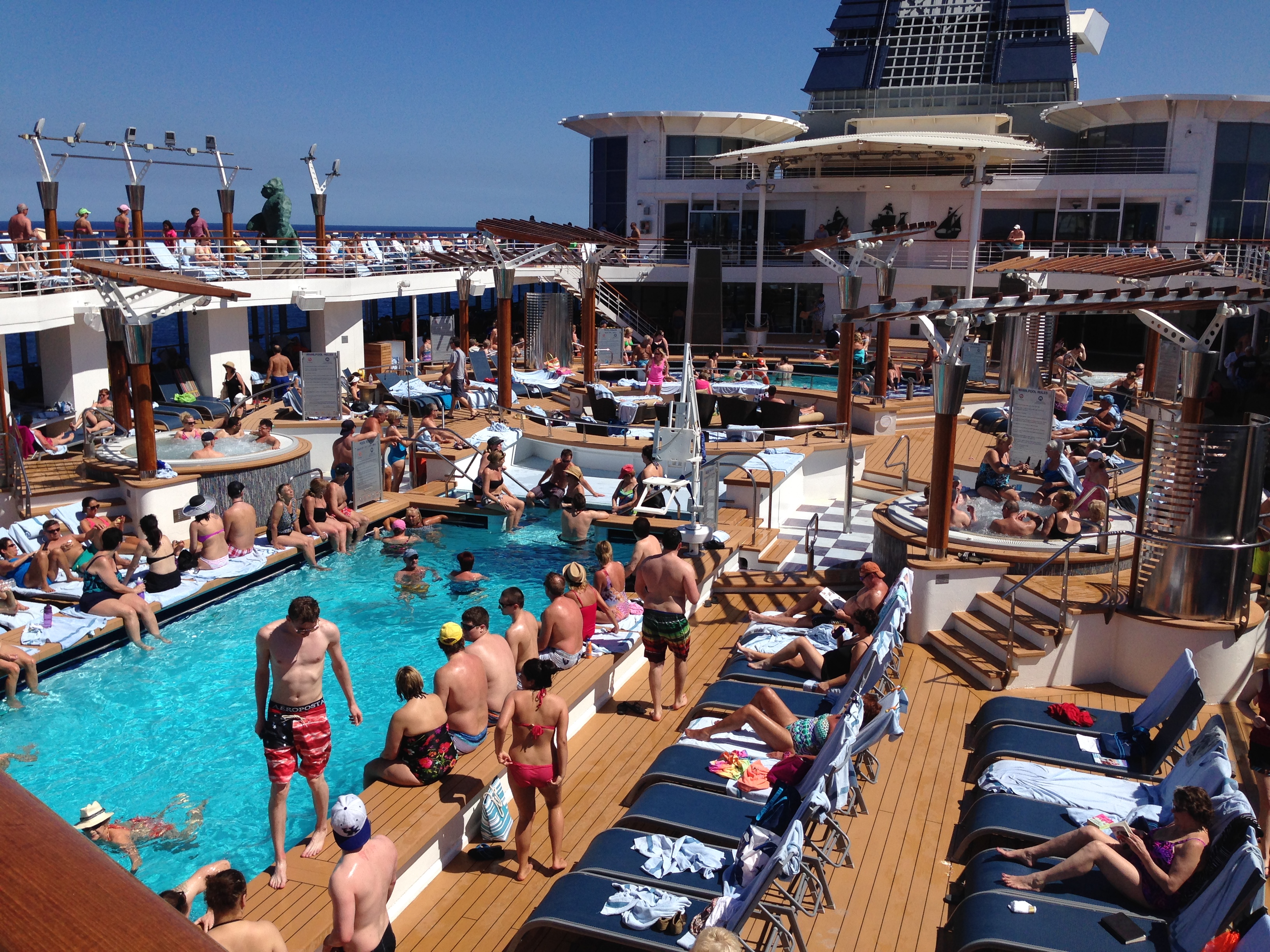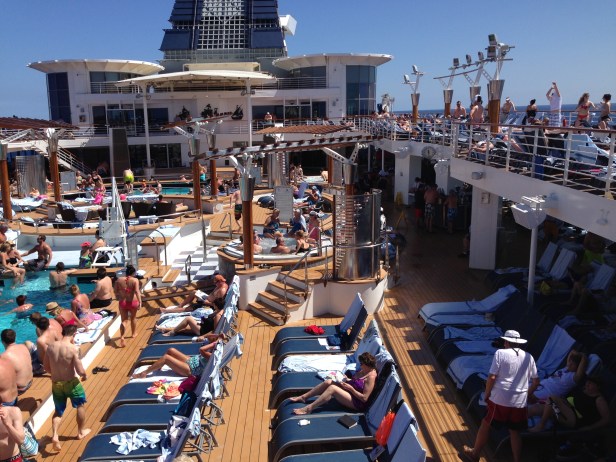 We went up on deck and were shocked to see the pool area already crowded and disco music playing. This wasn’t how we imagined our cruise to be – this was more like one of those party boats that go out on day trips to the Bahamas.