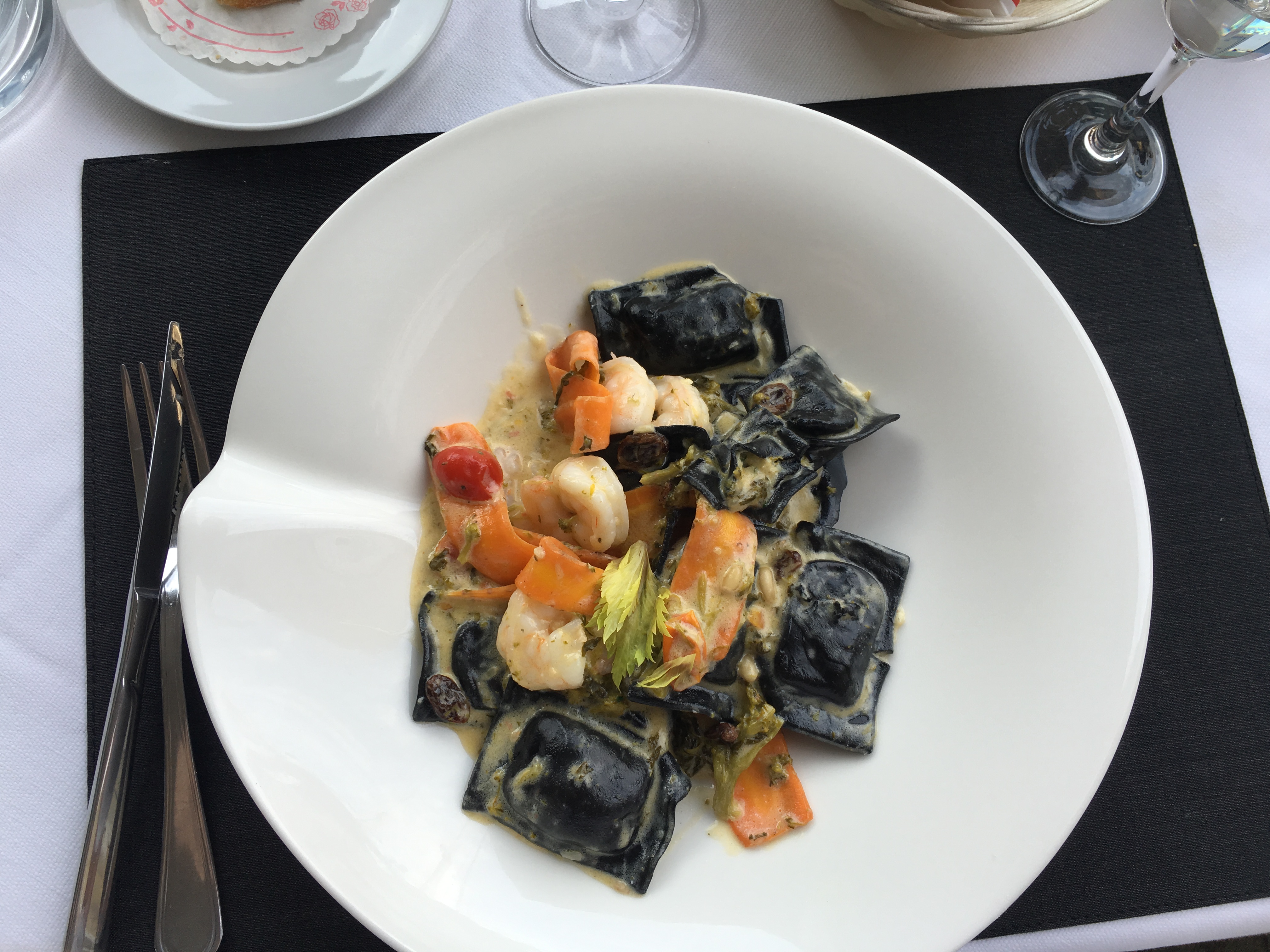 We didn’t want a full Italian meal and just talked to the owner about the pasta options. A squid-ink black ravioli, stuffed with sea bass (26 Euros), sounded delicious, as did the ravioli stuffed with mushrooms and truffles (28 Euros) – we ordered one of each.