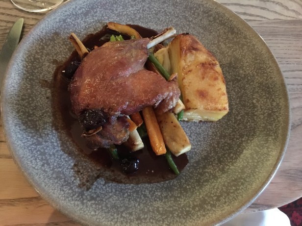 Duck leg confit with black cherry sauce, Dauphinoise potato, pot-roasted carrots, celery, parsnip & French beans £16.55