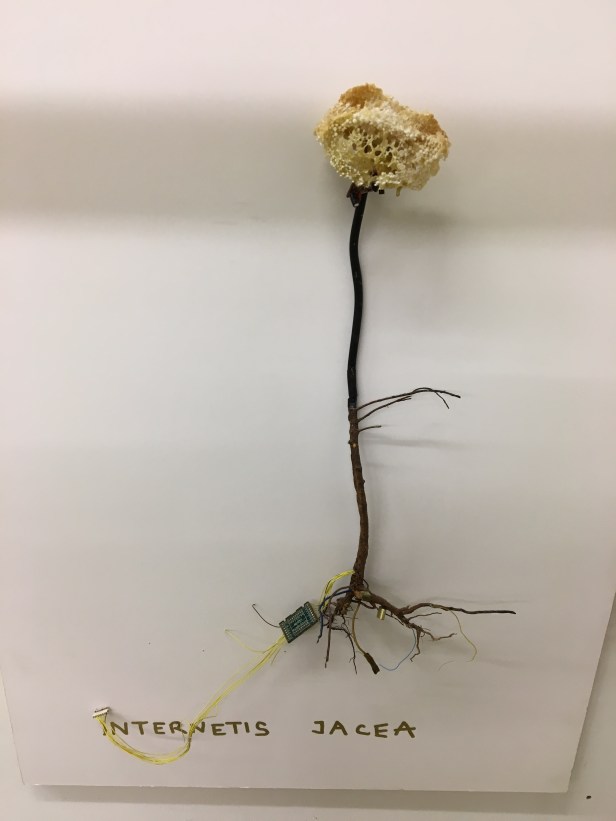 An attractive wire flower, with a joke Latin botanical name, sat in a glass-covered frame: