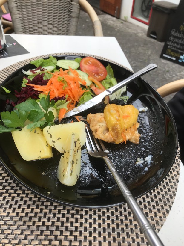 The classic Madeira dishes are garlic bread and scabbard fish with banana. Prices vary but we found a great café, called Raiz Quadrada, that offered these classic dishes at almost half the price of many other places. The fish dish was only 8 EUR.