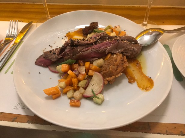 Drinks, olives and bread arrived. Our waitress returned with a chalkboard listing that day’s menu in Spanish. She described every menu item with passion and made everything sound delicious. We opted for a wild boar dish (Tataki) 17 EUR and the ConTenedor signature dish which I think was 15 EUR. Everything was excellent.