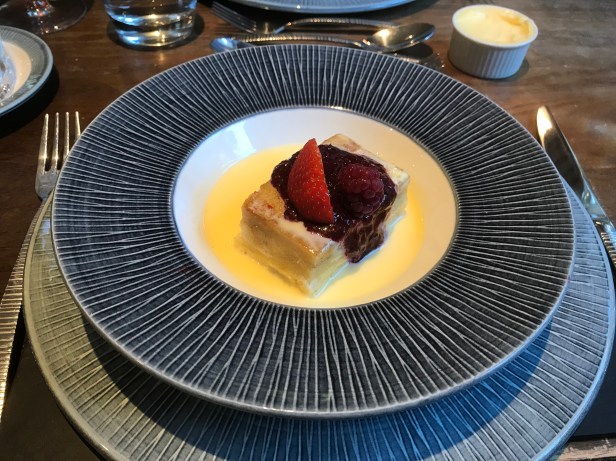 Dishes were presented without any announcement – they were just plonked in front of us by one of the waiting staff, who immediately walked away. This wouldn’t have been such an issue, except that our bread and butter pudding was delivered as the second course, just after the scallops. We had to wave someone down and the pudding disappeared back to the kitchen. It looked good and was when we finally got another chance to eat it later that evening.