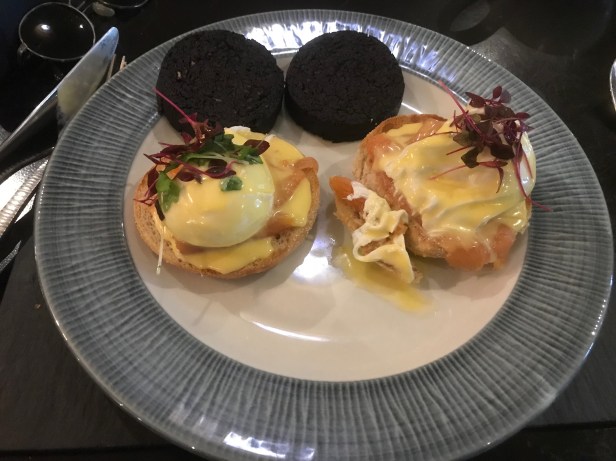 Breakfast was excellent; cold pastries, meats and fruits and cooked to order breakfast. I chose my favourite – Eggs Royale with a side of black pudding. It looked so good that I cut into it before remembering to take a picture.