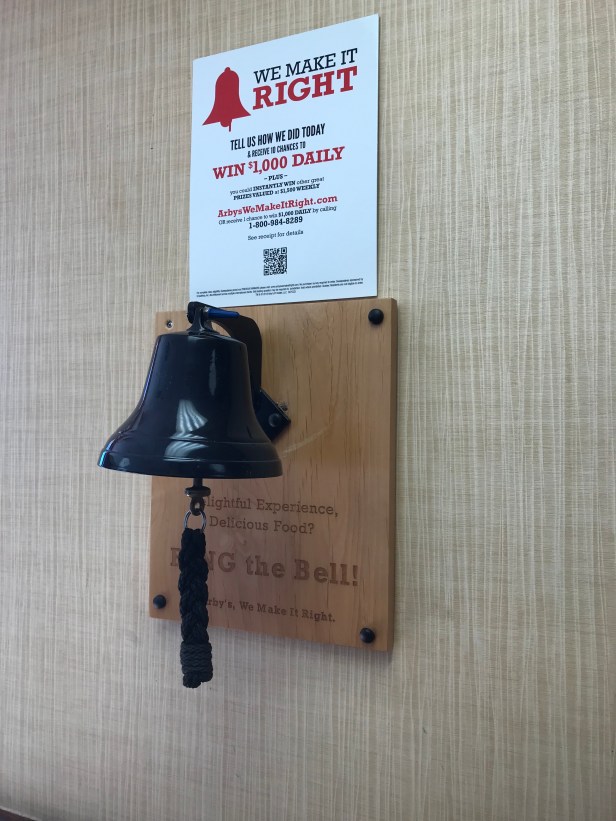There is a bell by the door and Arbys encourage customers to ring the bell when they have experienced good food and service.