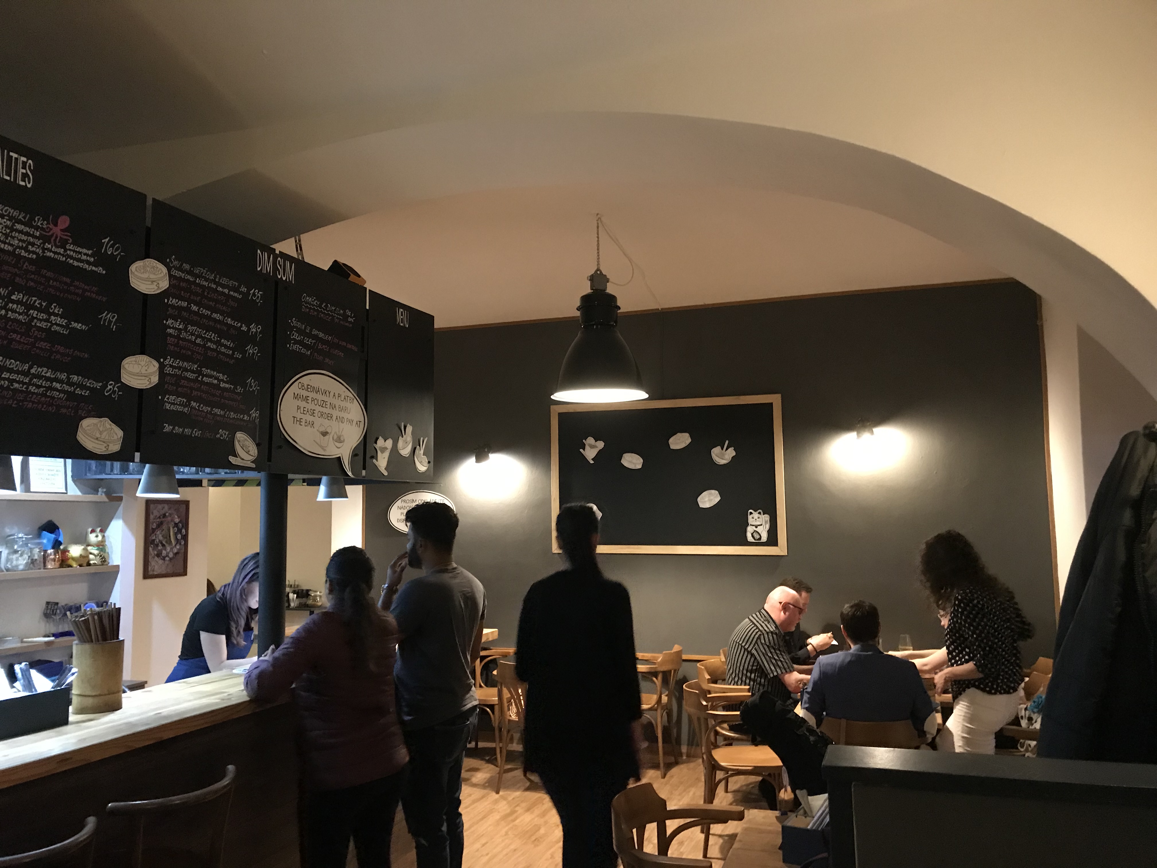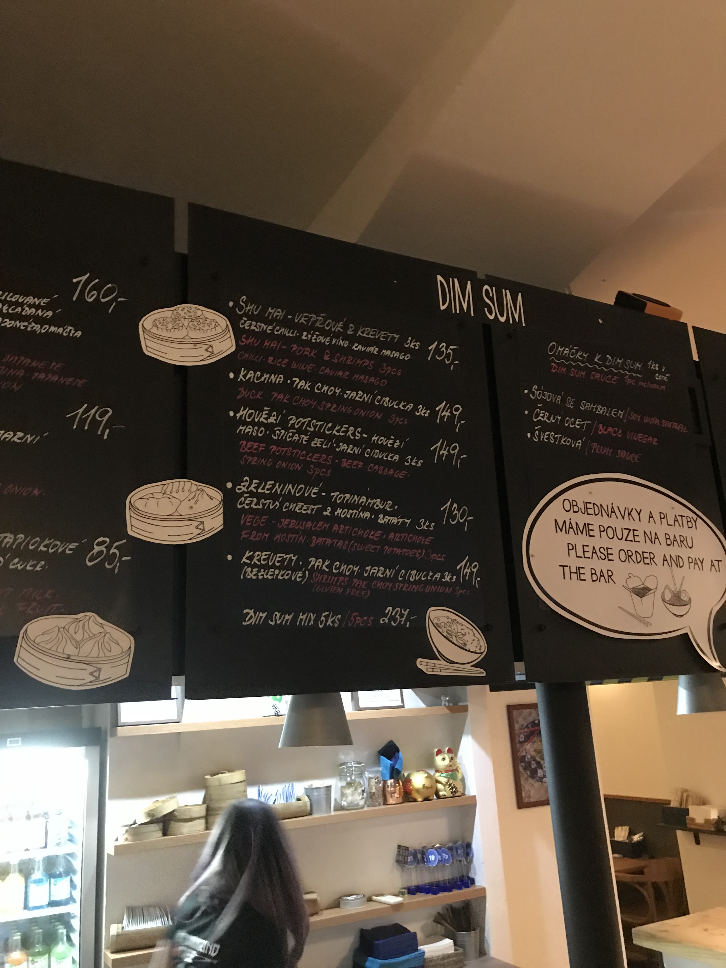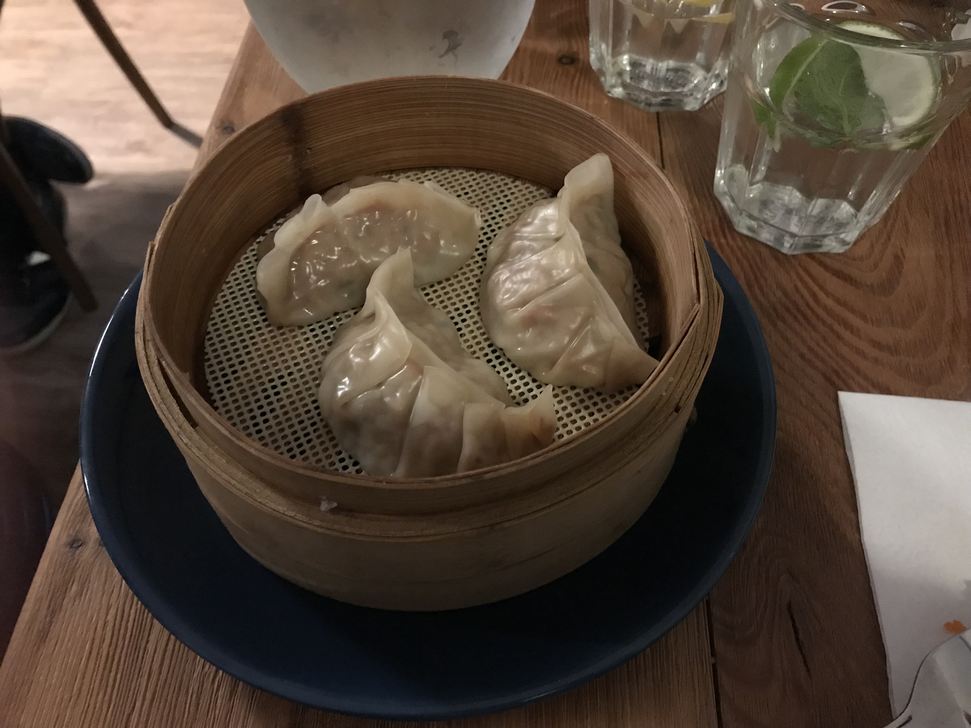 All of our food arrived at once within five minutes – we didn’t have to go and collect it. The two glasses of wine were a few minutes later than that. The dim sum (three pieces (duck 149 Kc three pieces pork & prawn 135 Kc) were contained in traditional steamer baskets, the five Japanese Takoyaki octopus balls were in a cardboard container. No plates were offered.