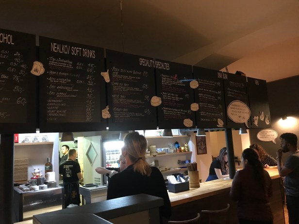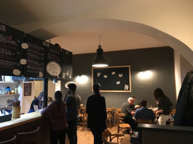 We went inside and sure enough, everyone was arriving at the same time. This was made worse because everything had to be ordered and paid for in advance at the counter. So we were among a group of people standing around looking at chalk boards, deciding and lining up to order and pay.