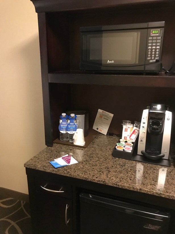 There was a microwave, coffee maker and two complimentary bottles of water.