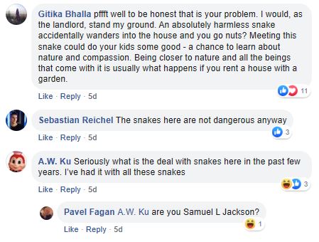 The conversation continued without ever properly identifying the snake, whether it had just slithered in or was the landlord’s pet. Aliya Nazarkasimova did ask if there was a company that provided anti-snake spraying services – like that is a thing!