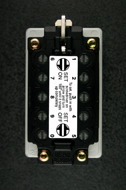 The inside of the lock box lid has a cover which, when opened, exposes 10 screws corresponding to the numbered buttons on the keypad. The screws have arrows on them. A combination is set (or reset) by changing the direction of the arrows for numbers in the combination.