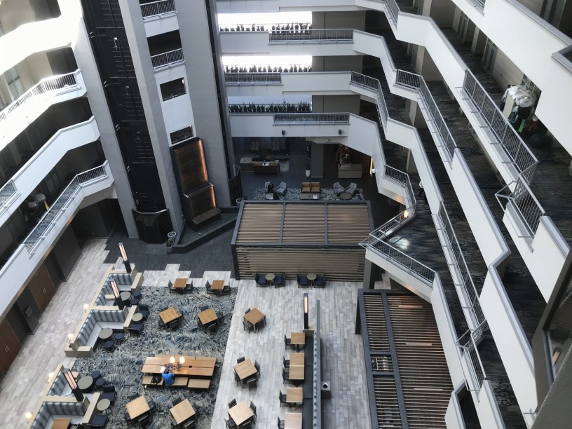 There was plenty of parking – we later found out that $14 was added to our bill for this. Check in was friendly and fast and we took the elevator to the top floor of the hotel atrium.