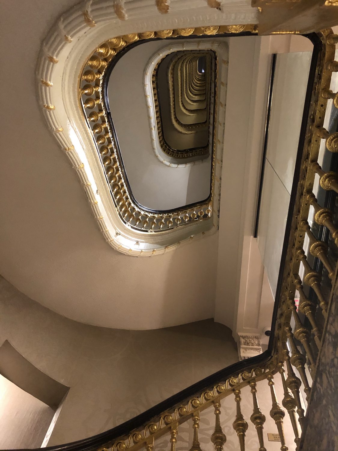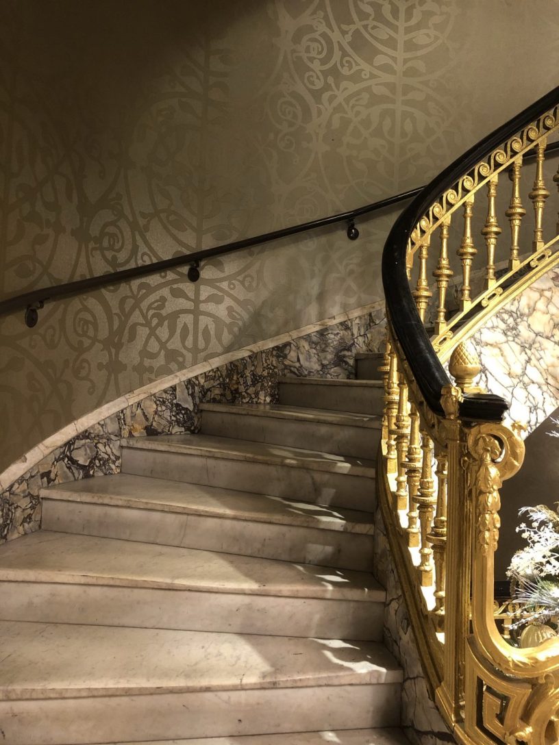 The elevators were opposite a beautiful ornate staircase.
