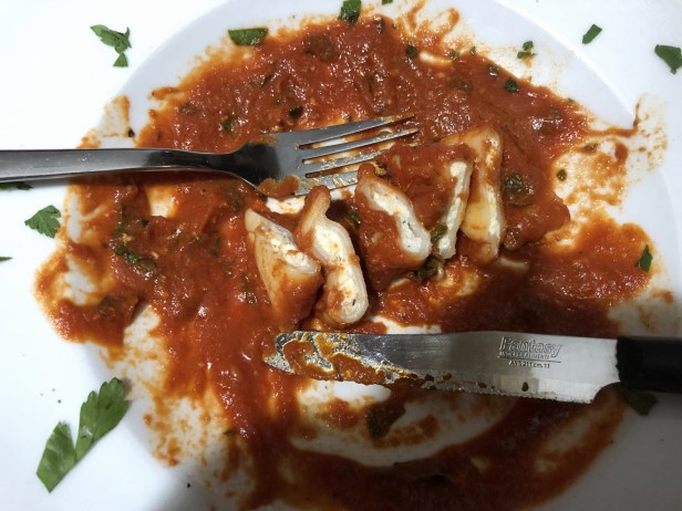 The ravioli was very average and the pasta too thick. Just in case you think I’m being picky, I cut the pieces in half to show how thick.