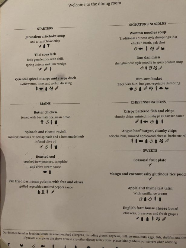 You can order drinks and food, although I find it’s quicker just to pop out to the lounge area and pour my own. The menu changes, but here is an example: