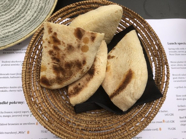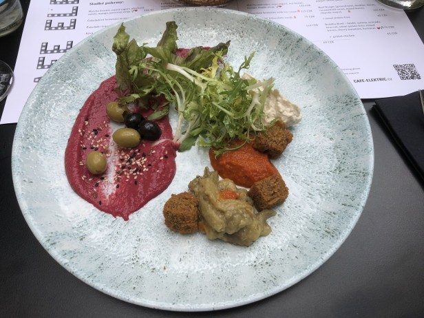 We shared a Mezze Platter; falafel, baba ghanoush, ajvar, olives, mixed leaves, hummus, beetroot hummus, pitta bread 155 Kč