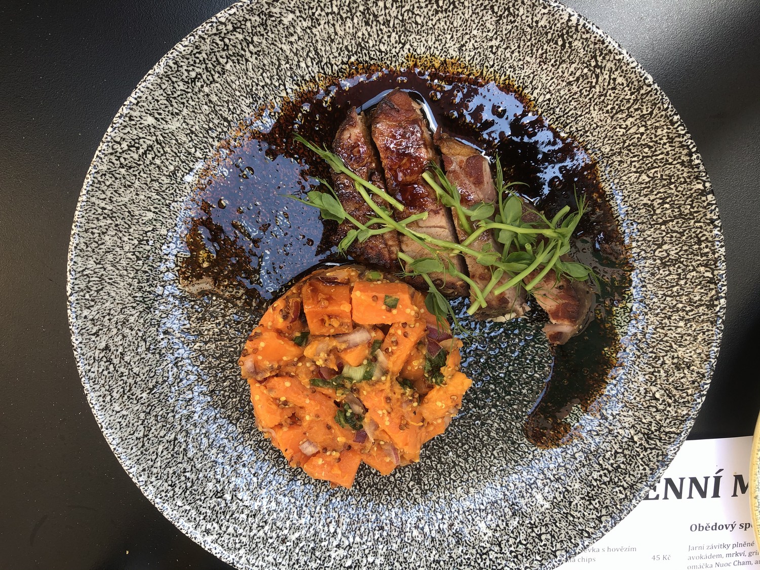 We both had slow-cooked veal with sweet potato salad 169 Kč