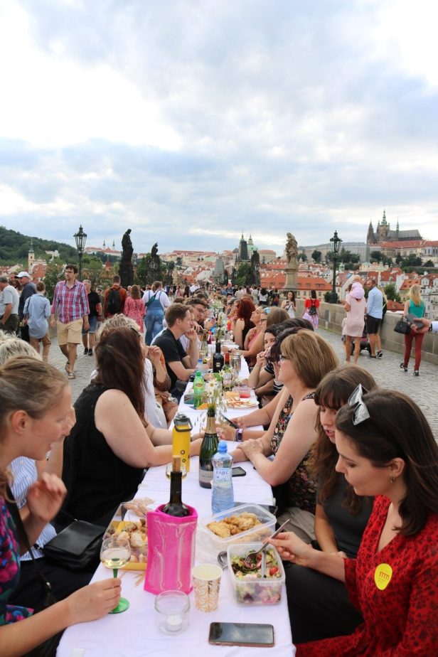 While the streets of the centre and the beautiful Old Town Square stood silent from the lack of tourists, another of the city’s icons, Charles Bridge, was more alive than ever. That night, the bridge served as a dining room for up to 400 people, who sat down to share food and drinks with friends, family and even strangers.