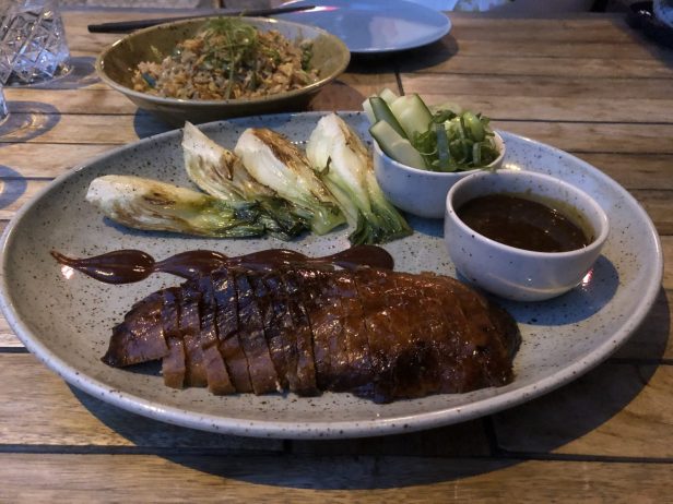 Cantonese duck breast, grilled bok choy, cucumber, scallion, Hoisin 338 Kč and fried rice 85 Kč.