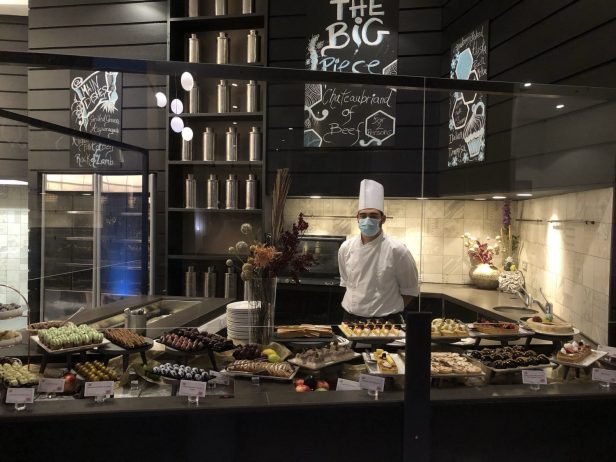 Barriers protect the buffets and all items are served to you.