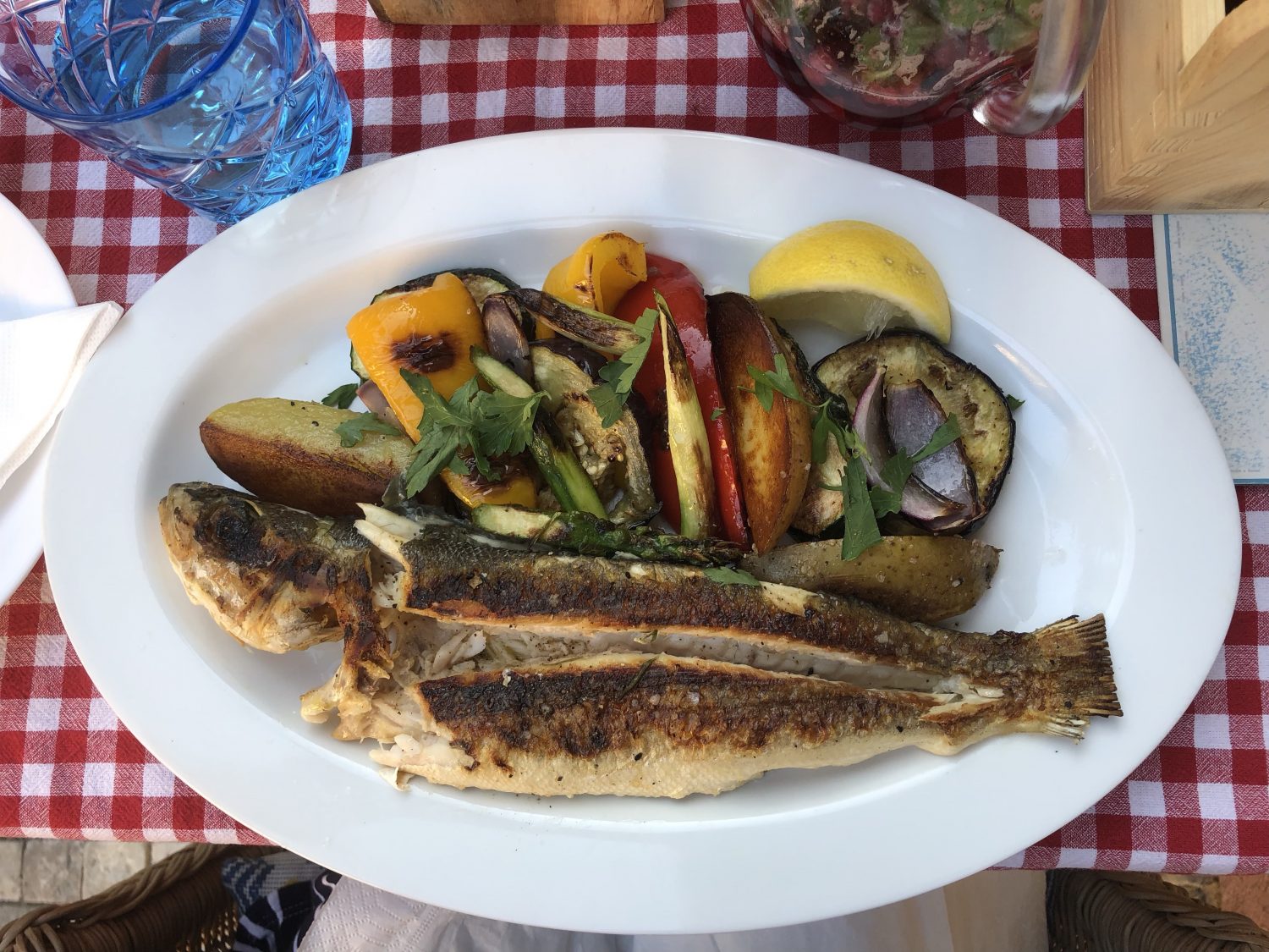 Sea bass on the grill, grilled vegetables (315 Kč).