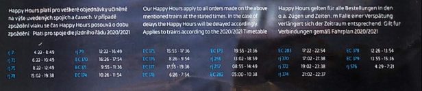 If you’re flexible about your travel times, it’s worth booking a ‘happy hour’ train – this picture from the menu onboard 14th July 2021, so may change.