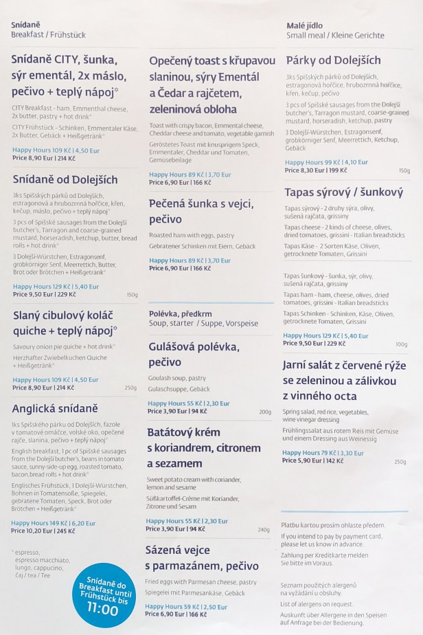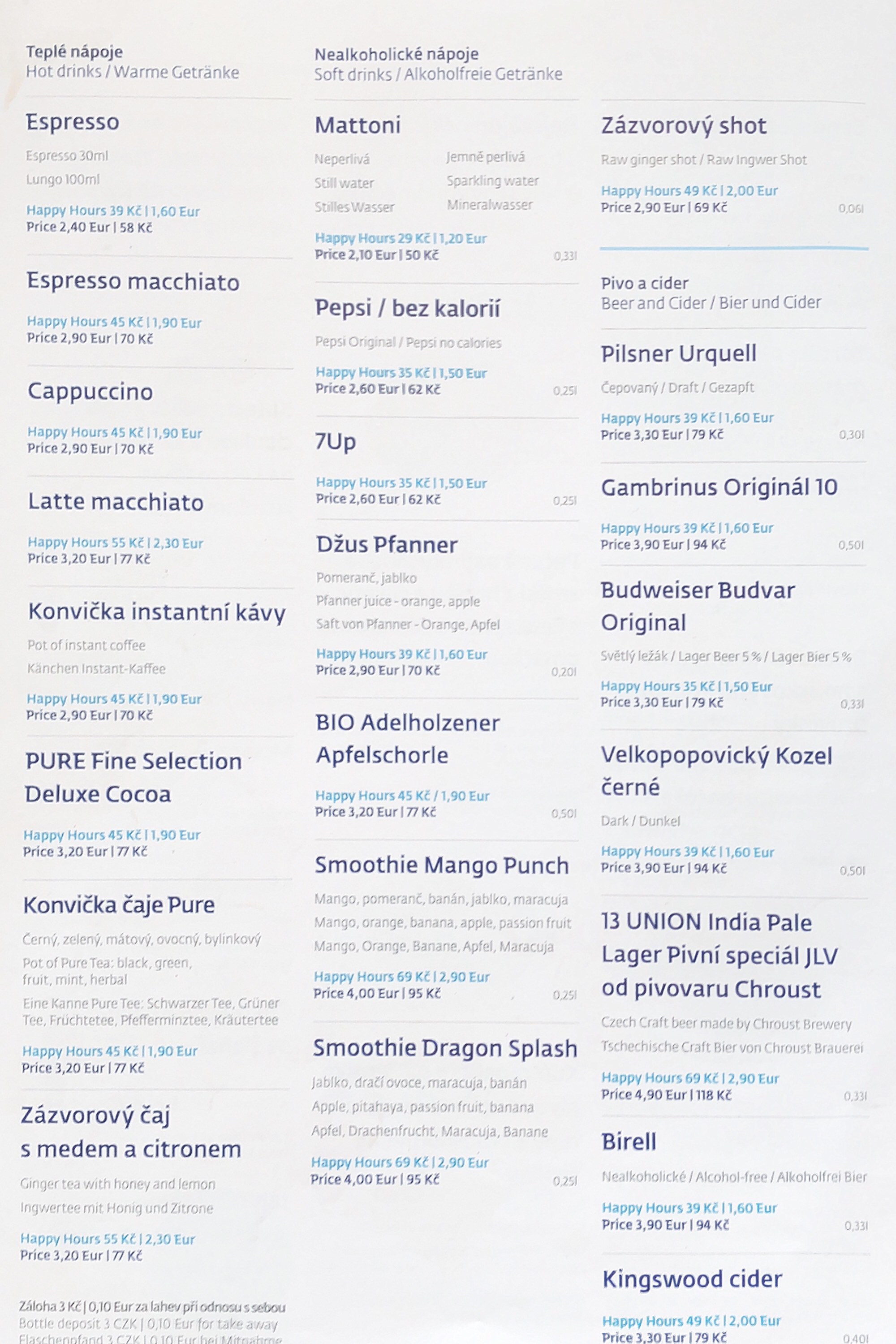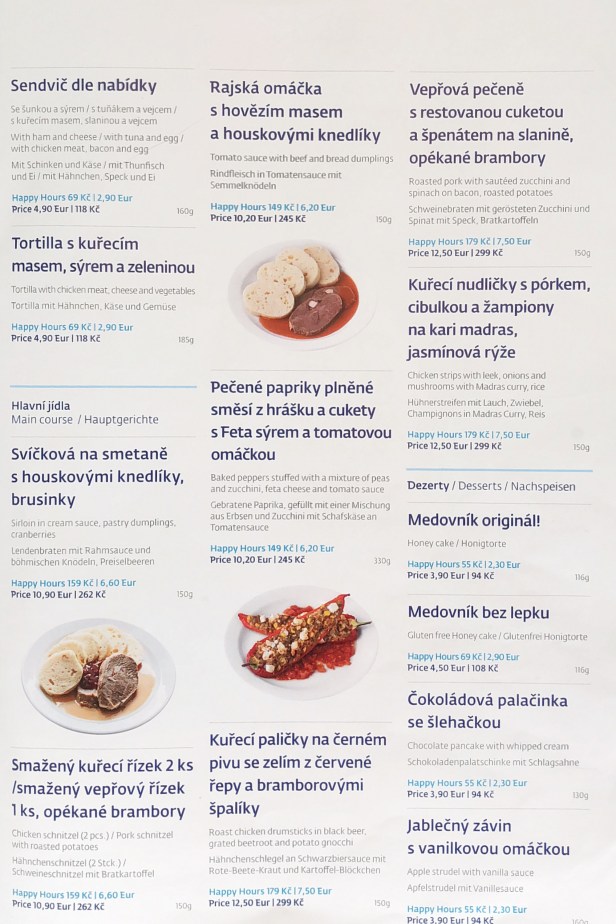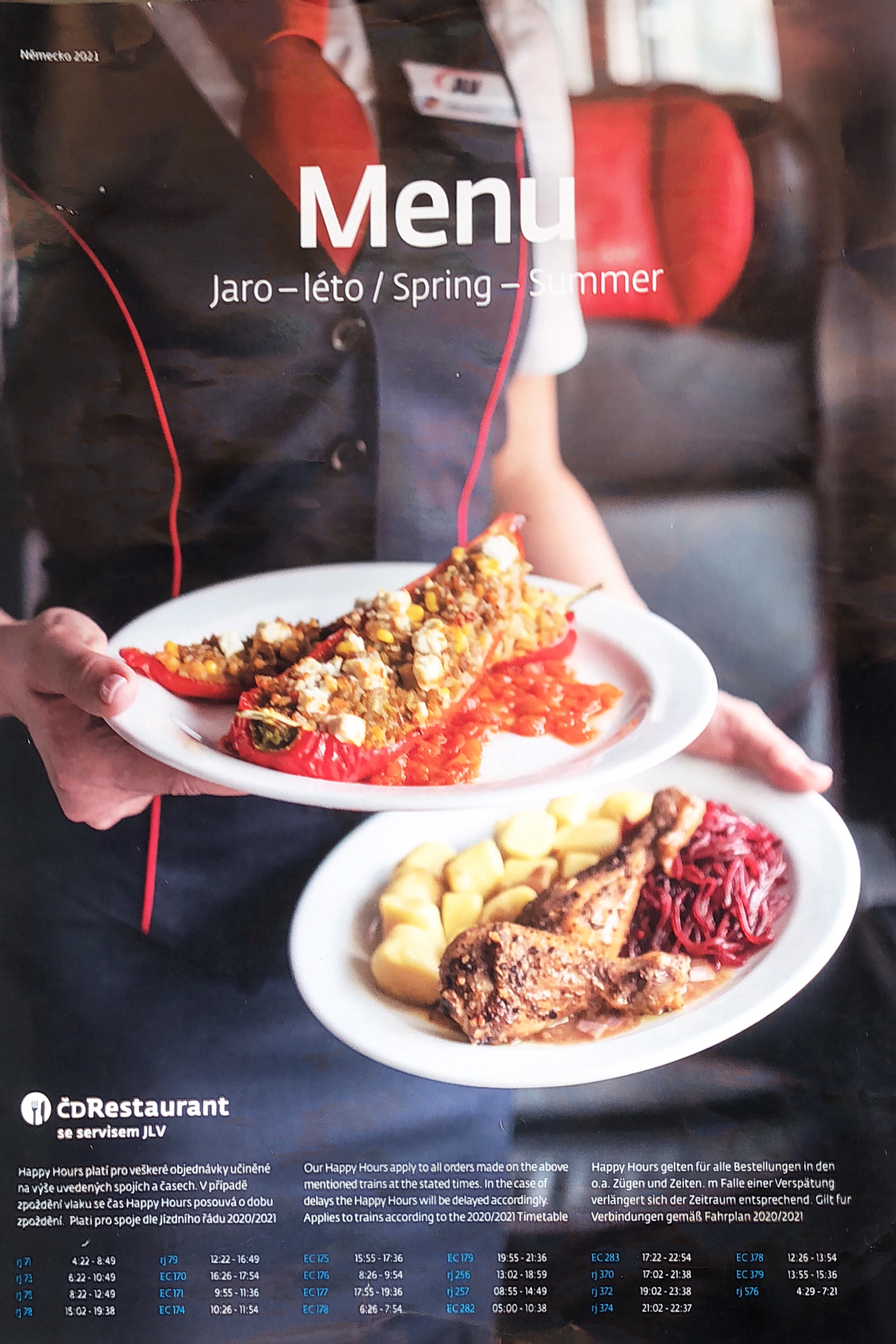 Each passenger in First Class receives a complimentary bottle of water. After that, the onboard staff will take your food and drinks order from the menu. If you are lucky, or have planned well, you benefit from ‘happy hour’ pricing. It really is happy hour when a 0.5l Gambrinus is reduced from 94 Kč to 39 Kč.