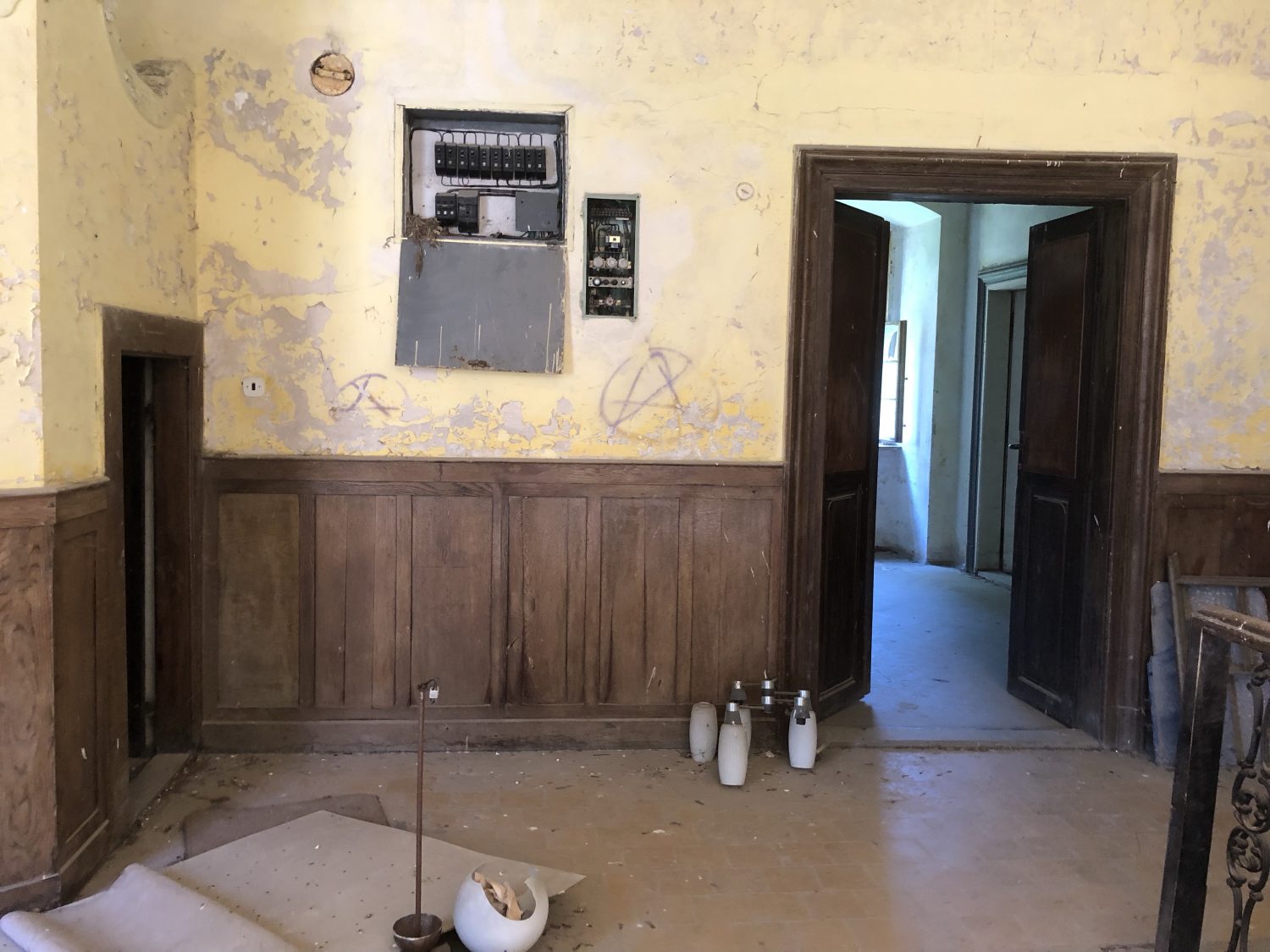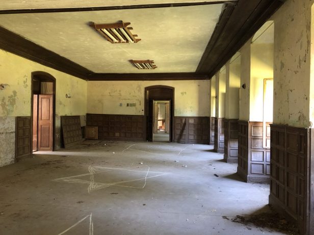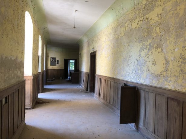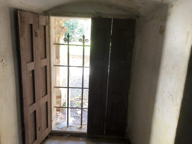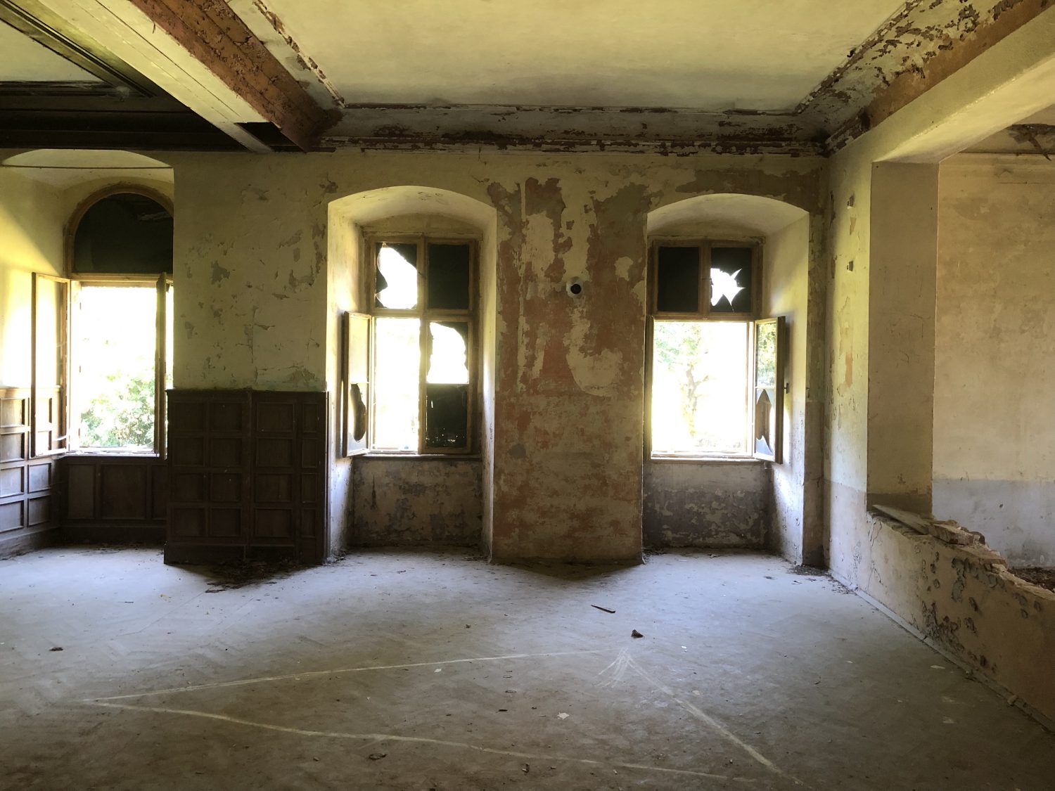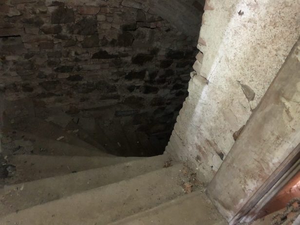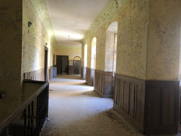 Inside there were some modern chairs that are perhaps stored by the Pension and used for weddings. There were some animal droppings on the floor – deer roam freely around the chateau and could be the source.