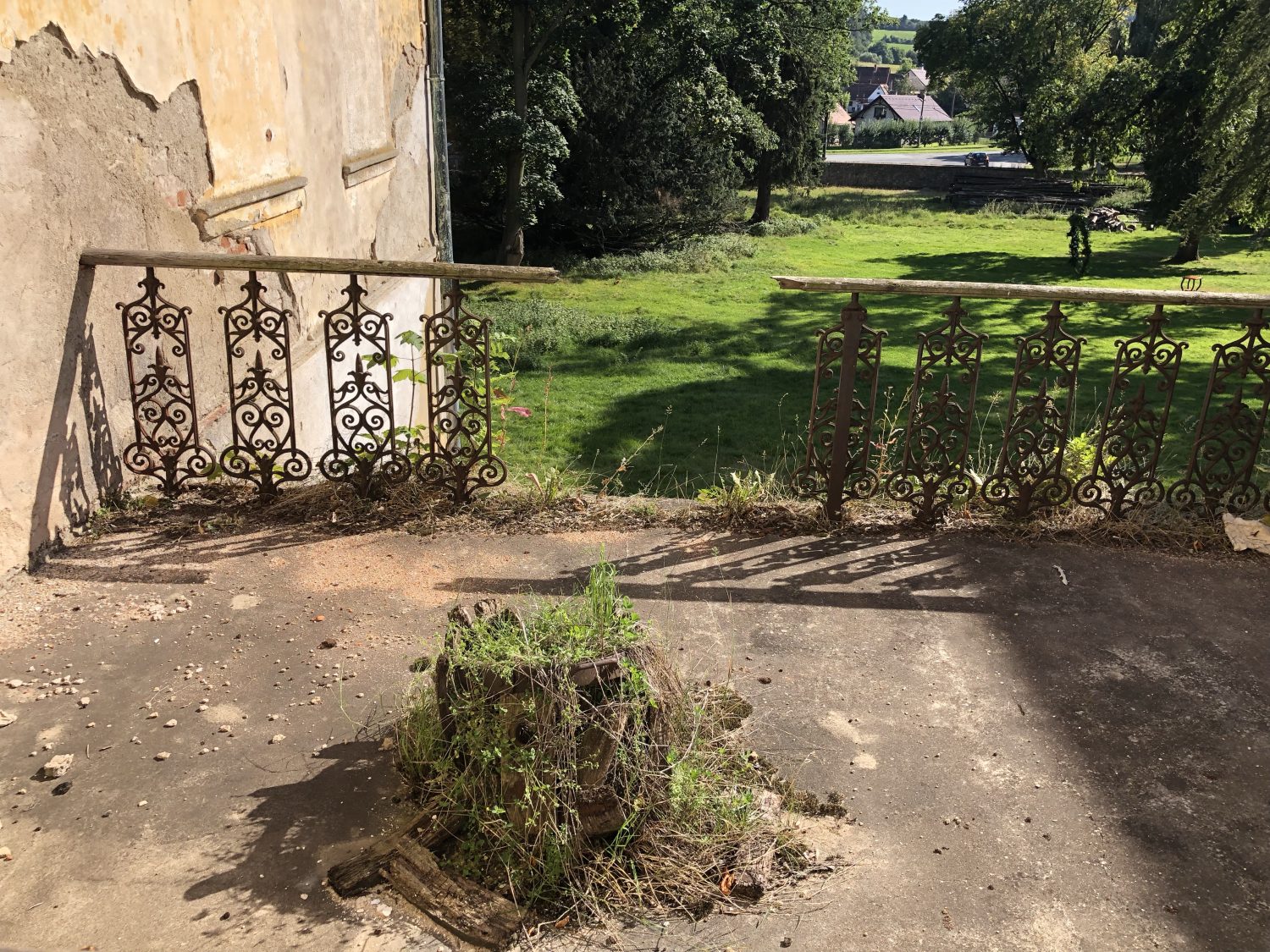 A once beautiful terrace looks out to the gardens.