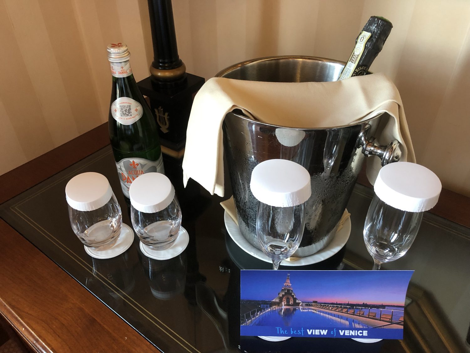 A bottle of water, a bottle of Prosecco and a hand-written welcome card were waiting in our room.