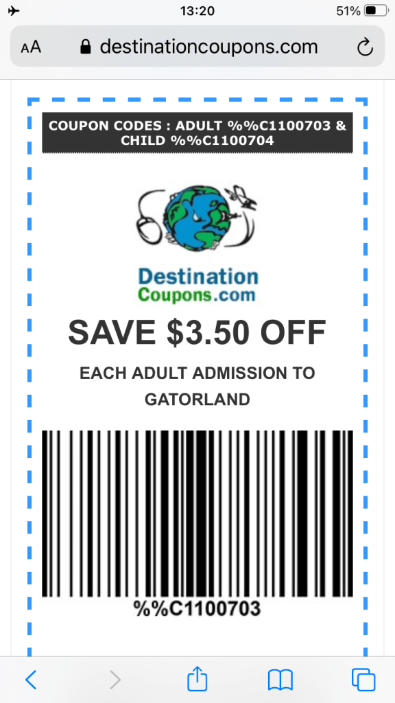 The standard adult entry ticket is US$32.99 + tax. That ticket doesn’t include train rides, zip line, food nor gator chow. I found a voucher online and that saved $3.50 per person. Voucher is at the end of this page.