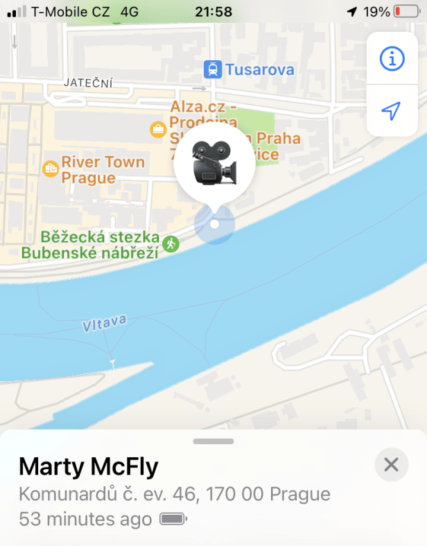 Monday 13th December 1:09 am, Marty was pinged passing under Libeň Bridge (Libeňský most) and had travelled around 5 km in total.
