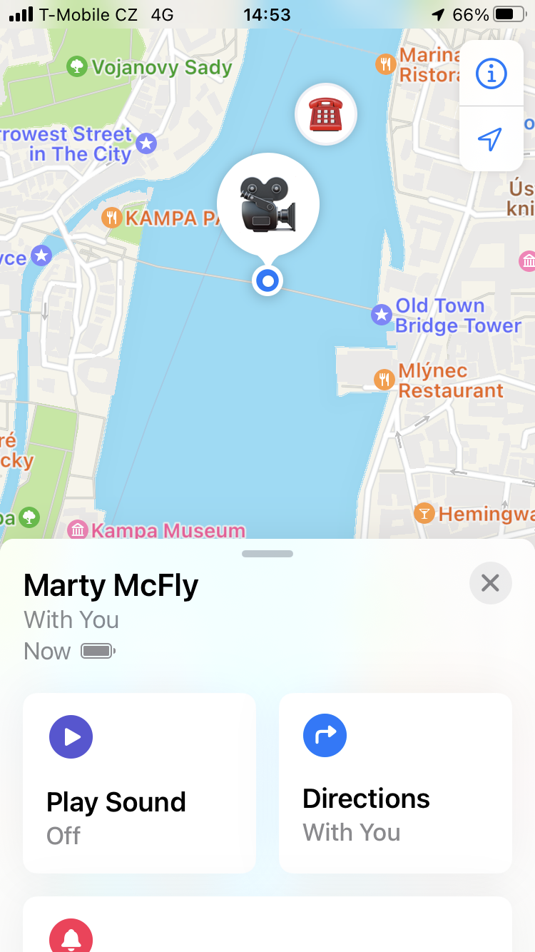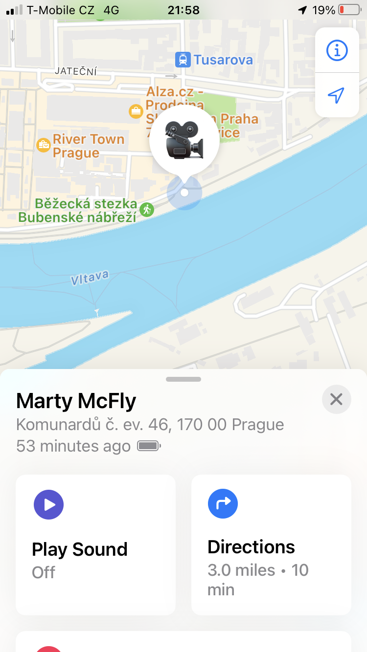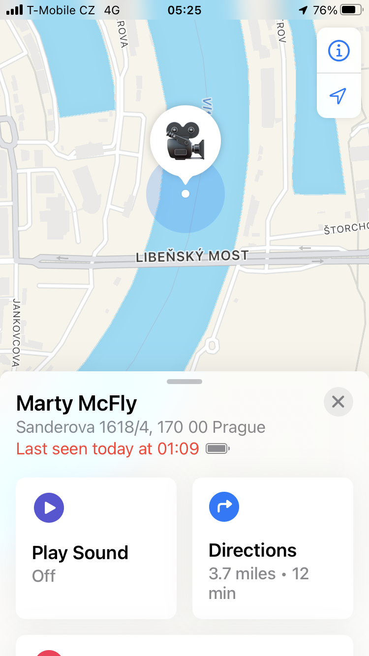 Monday 13th December 1:09 am, Marty was pinged passing under Libeň Bridge (Libeňský most) and had travelled around 5 km in total.