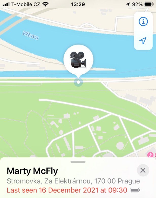 On Sunday 12th December 2021, a cannister containing an Apple AirTag, a note, five Euros and a Marty McFly figure, ‘fell’ into the Vltava river in Prague. Marty’s journey started well until we lost contact a few days ago.