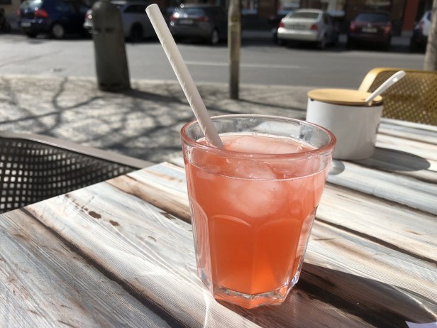 We were lucky to find the last available outside table. The waiter brought a lunch menu and two complimentary non-alcoholic drinks.