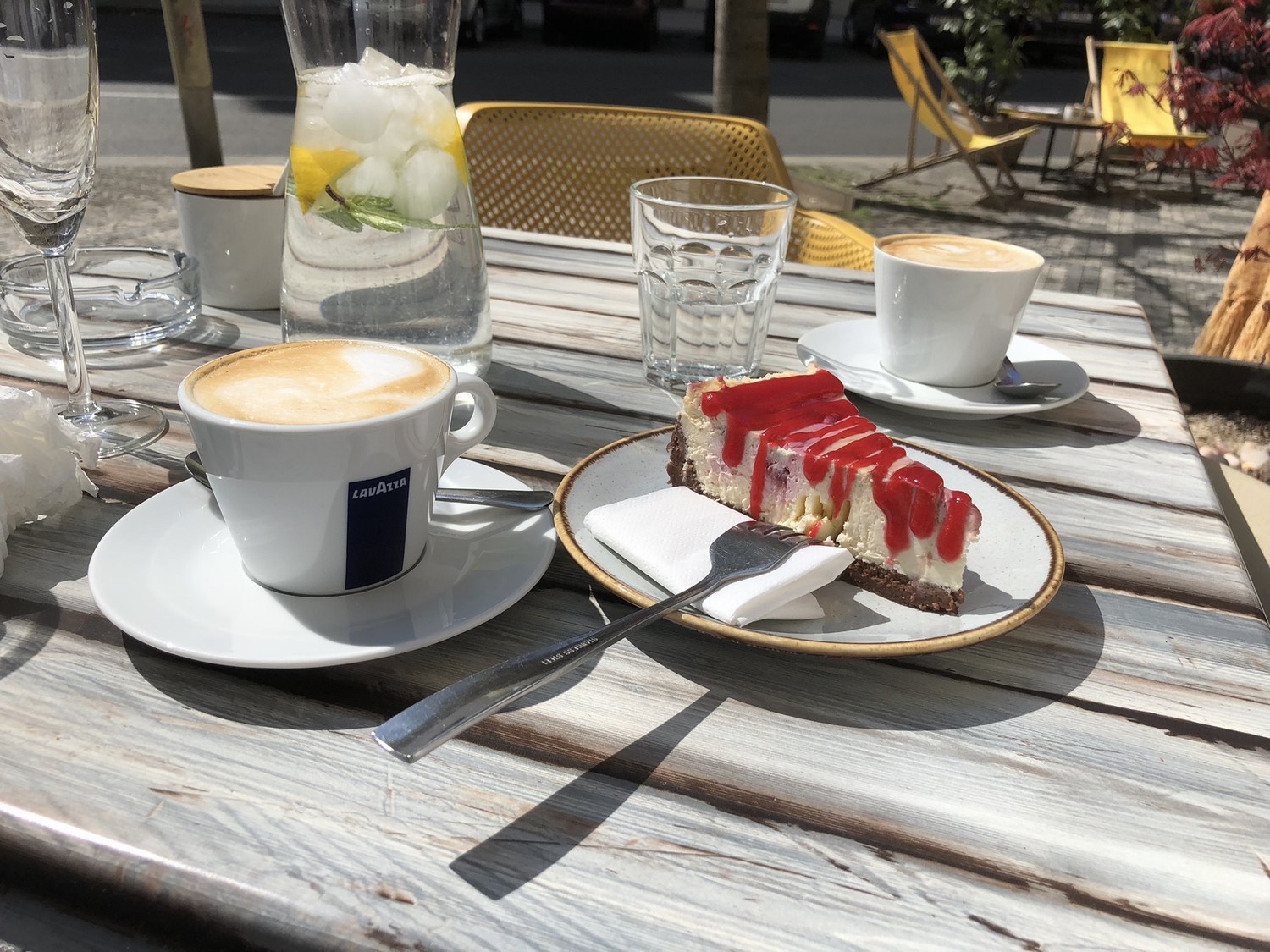 We later had two cappuccinos (59 Kč per) and shared a delicious strawberry cheesecake (120 Kč).