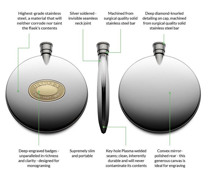 The Dalvey Flask is the ultimate hip flask and travel companion. Its circular shape fits nicely in my pocket and was a perfect whisky container for over twenty-five years, until it recently started to leak.