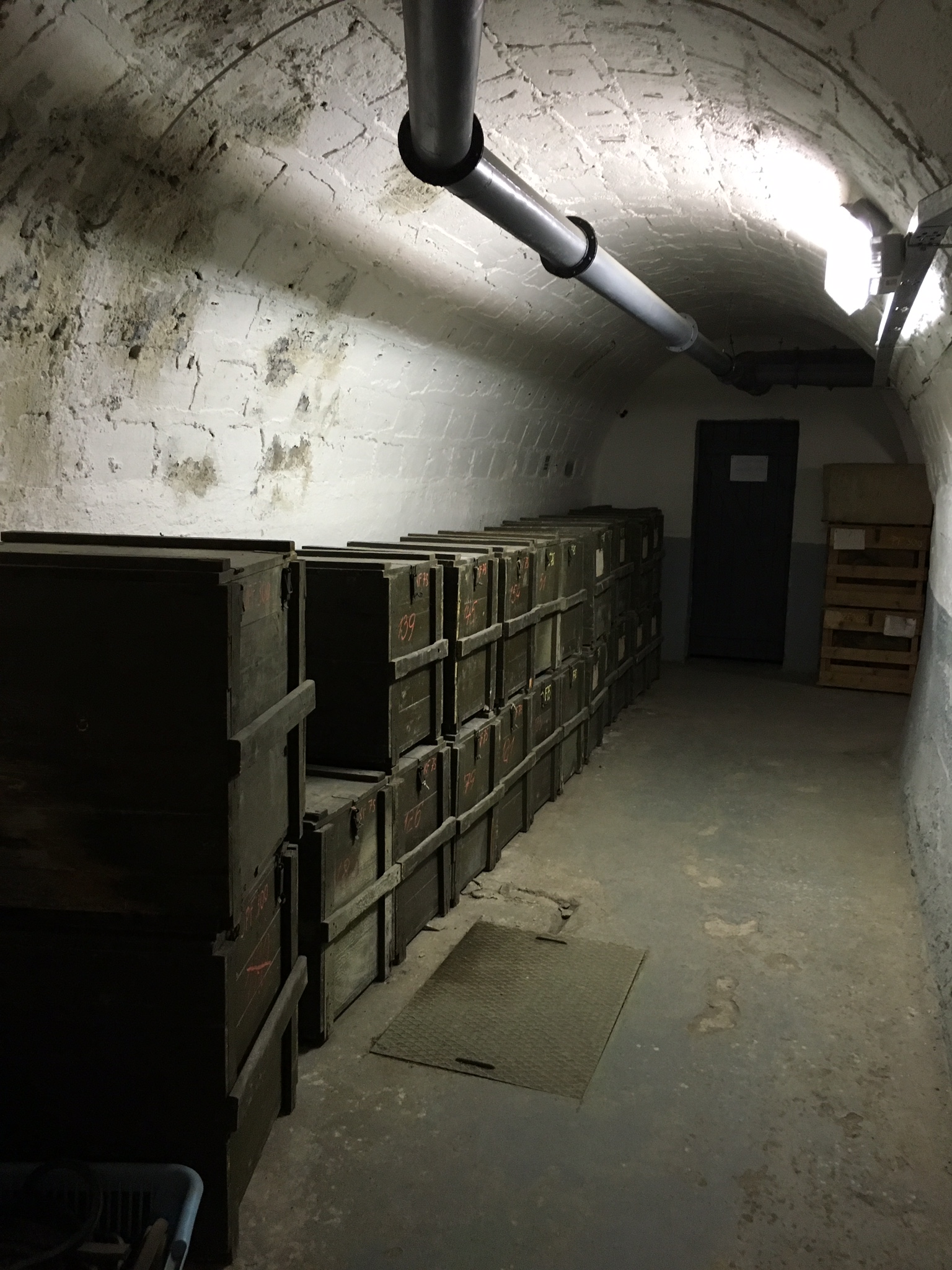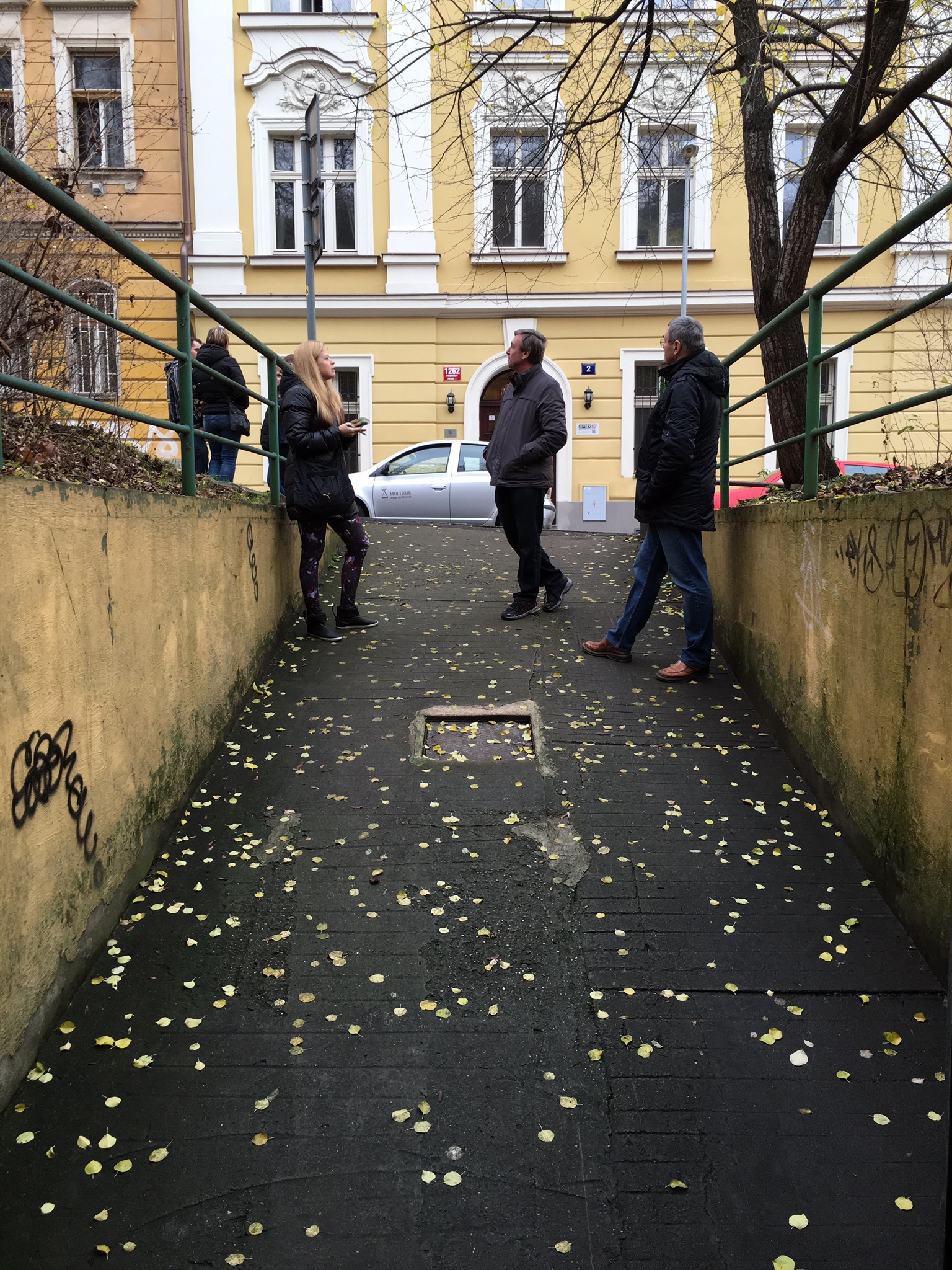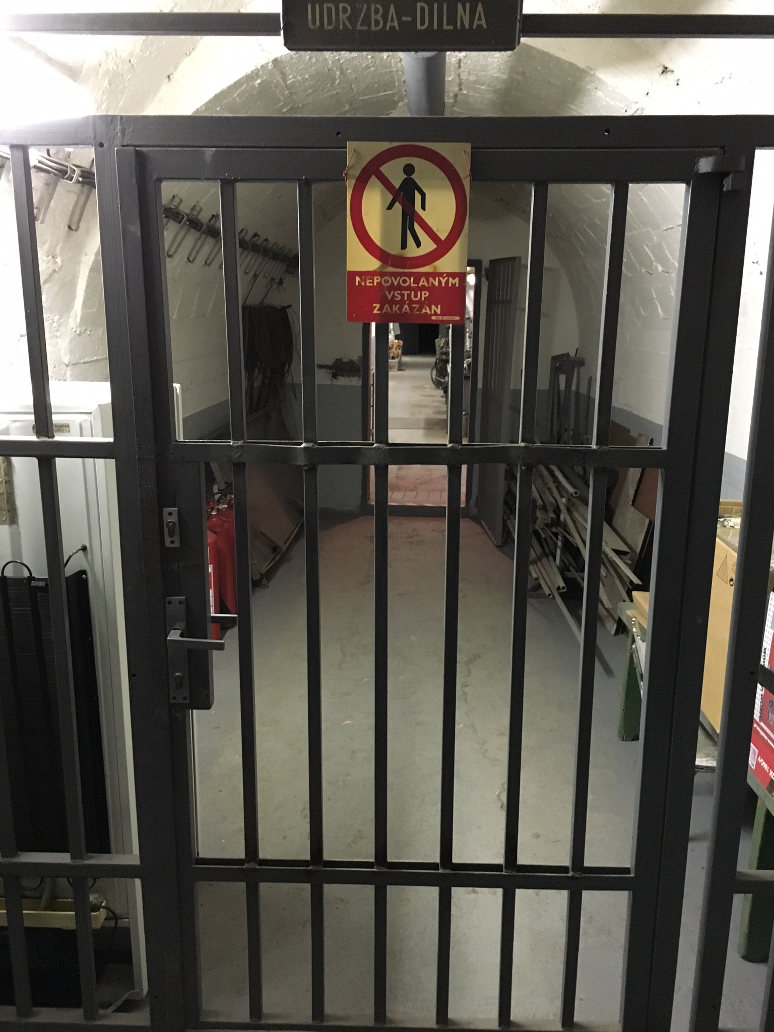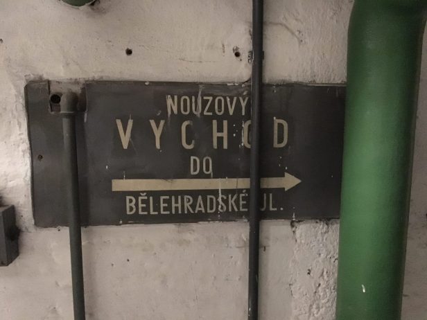 I followed signs to the Bělehradská street exit and found myself walking up two steep tunnels. I finally arrived at a large, locked iron door. Later when I was back outside, I could guess that this door was on the top of the hill – I’d hardly noticed it before.
