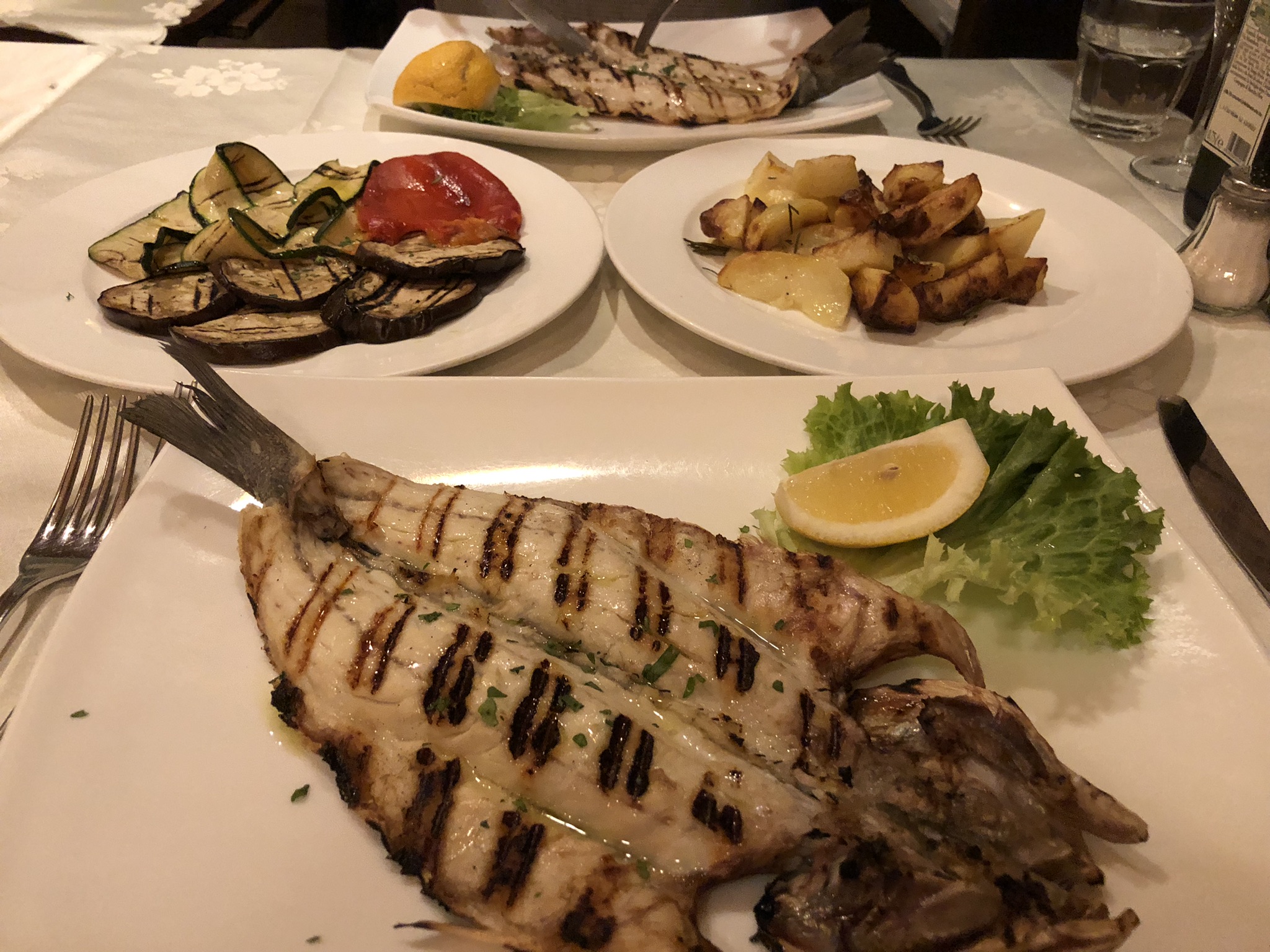 Sea Bass was €18, the side dishes of roast potatoes and mixed vegetables €5 each.