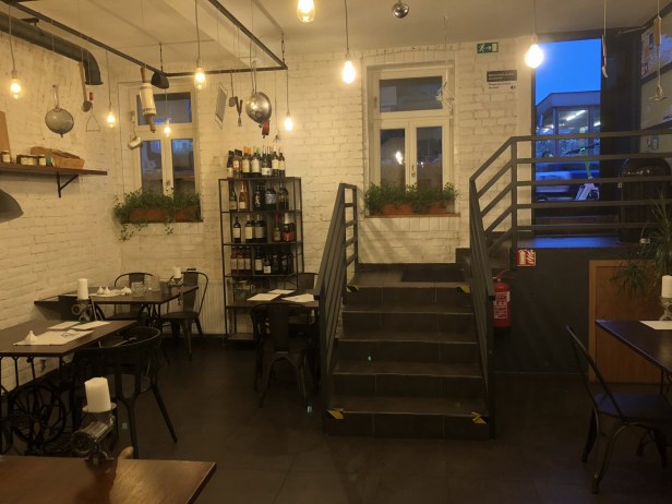 A 0.1l glass of house red was 41 Kč – still not sure why Prague restaurants have started selling 0.1l glasses instead of 0.15l. We asked for a jug of tap water and were told, sternly, that they didn’t serve tap water. We asked for a large bottle of water and were told that only 0.33l bottles at 35 Kč each were available. So not a good start.