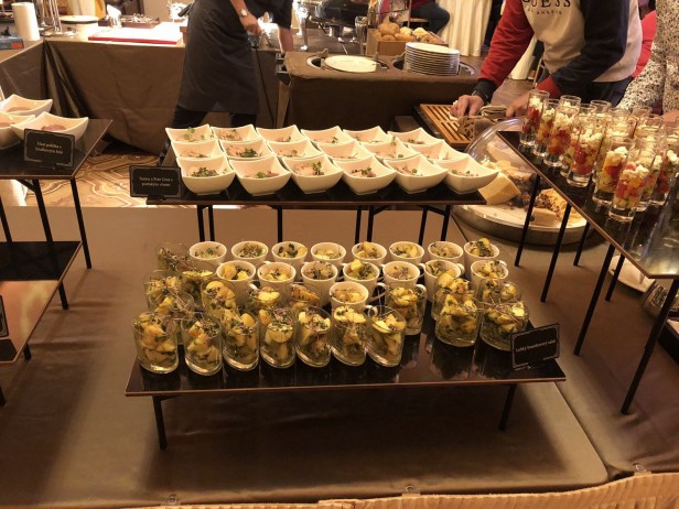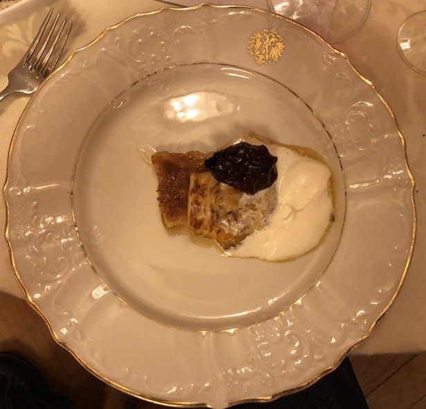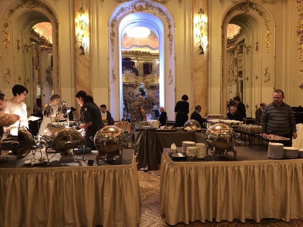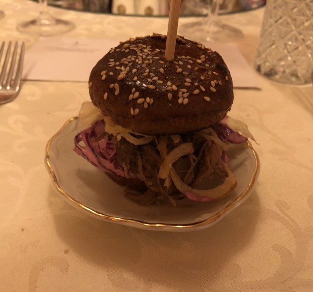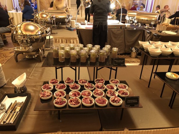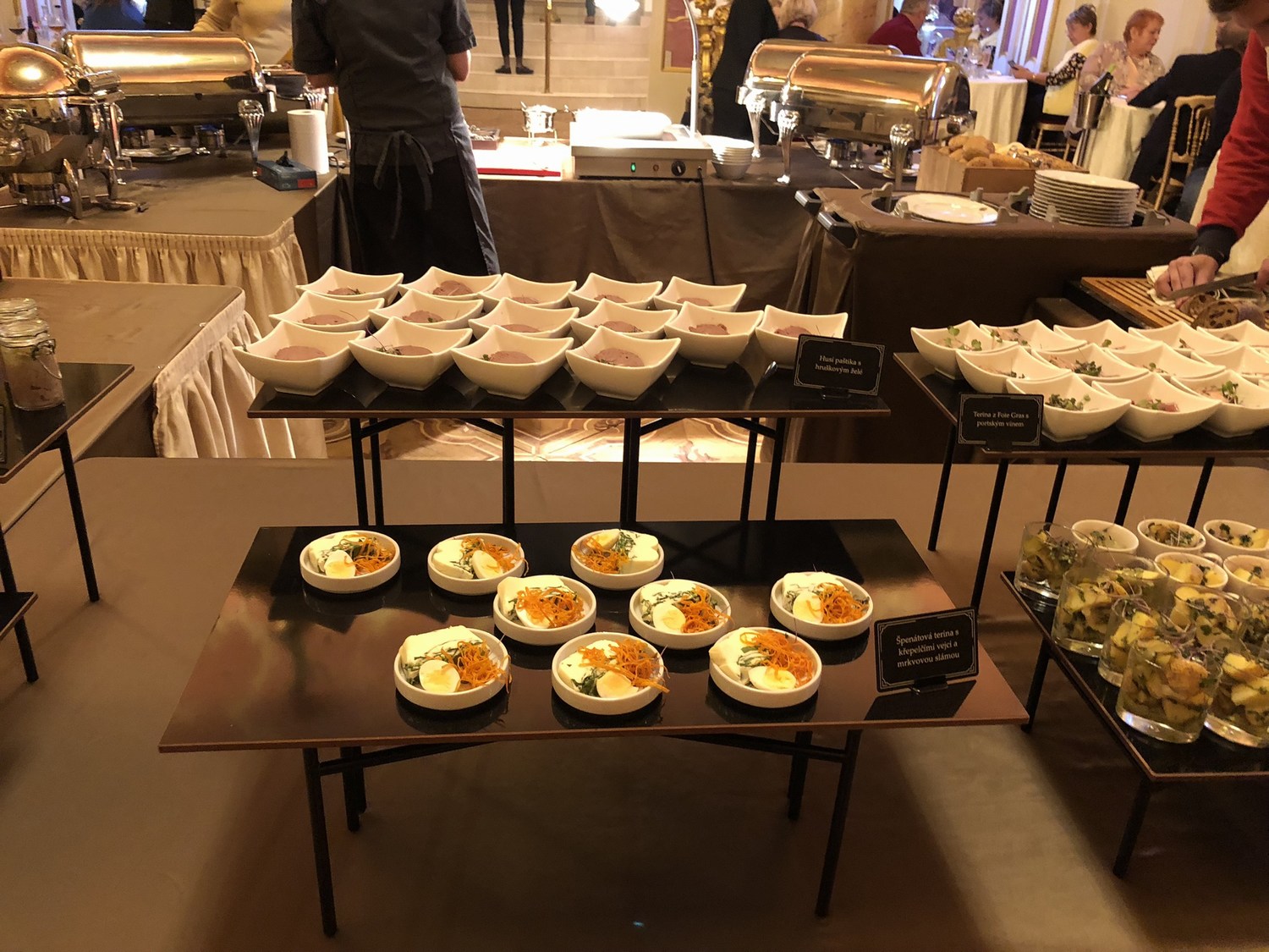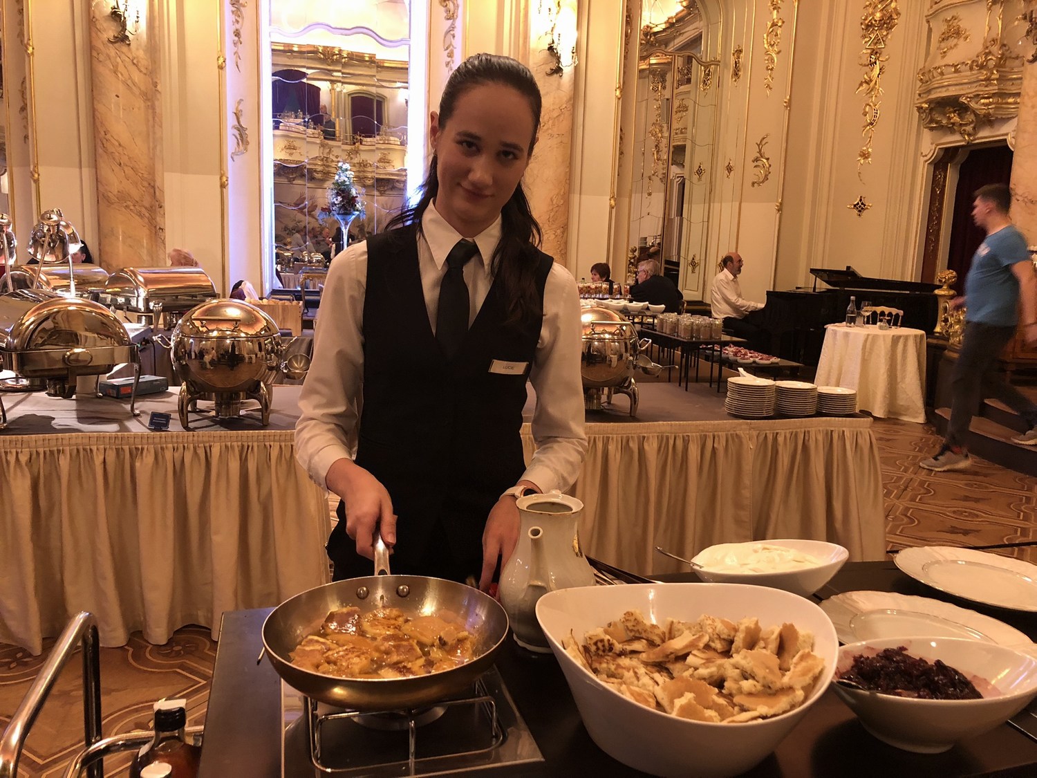 In addition to the buffet, there were several welcome tableside offerings; mini burgers (sliders), flambéed crêpes and even a glass of the Czech plum spirit Slivovice.