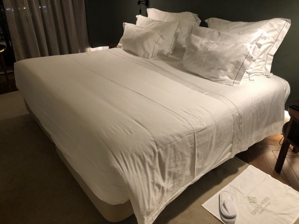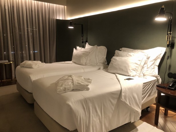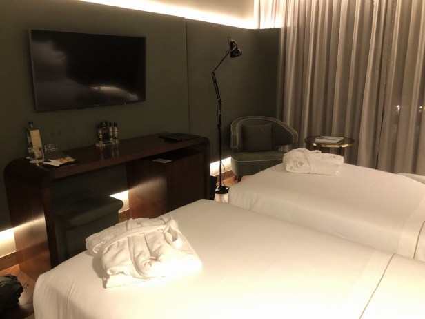 The room was beautifully appointed, although configured as two singles. Bathrobes and slippers waiting. Chocolates on the turned-down sheets.