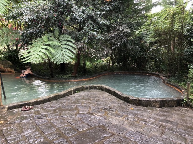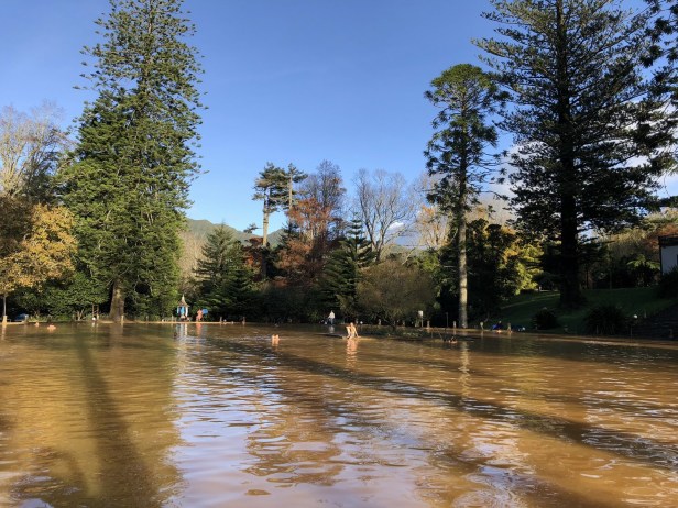 The large thermal pool is rich in iron and other minerals, hence the colour – good for the skin apparently.