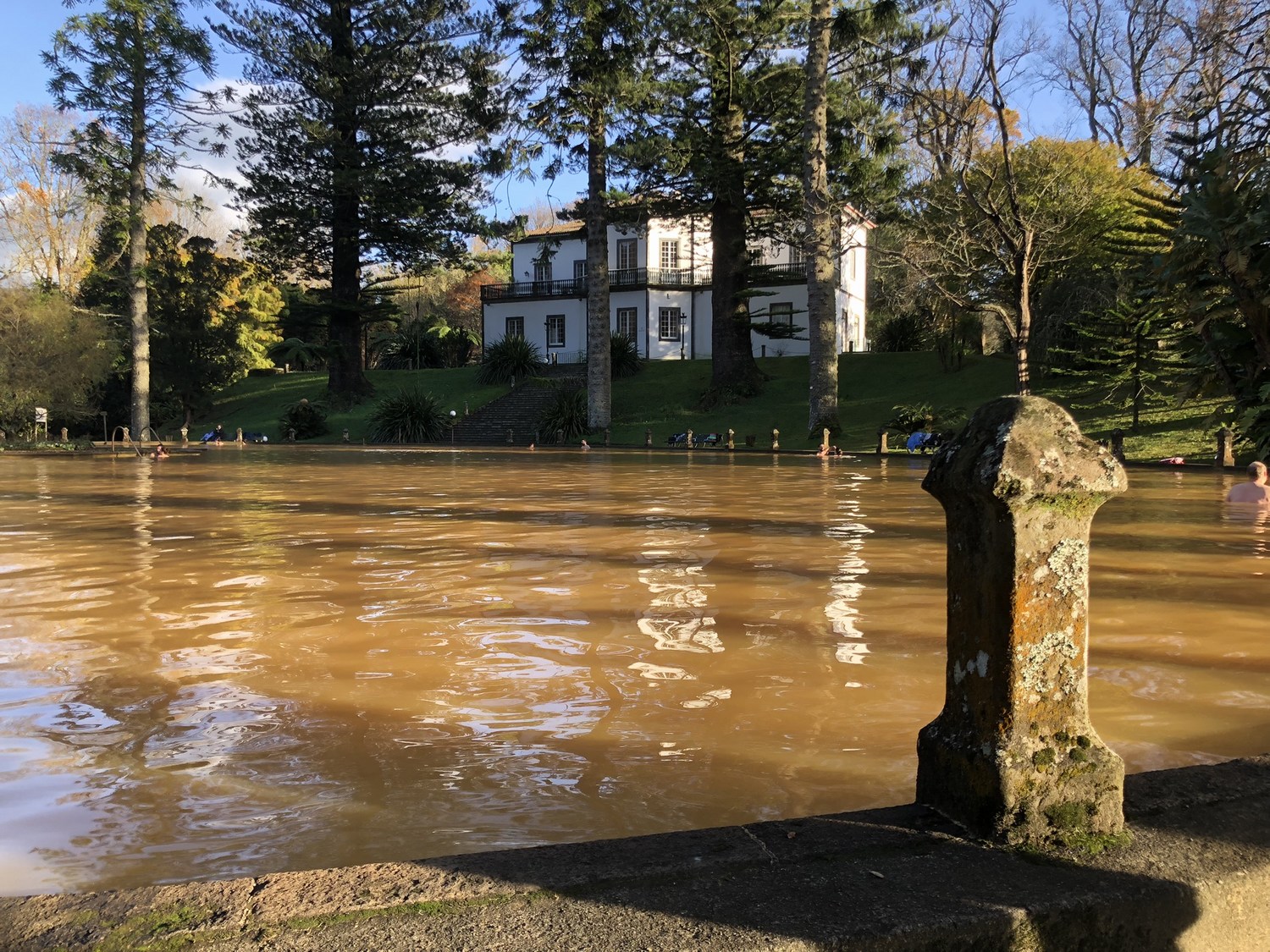 The large thermal pool is rich in iron and other minerals, hence the colour – good for the skin apparently.