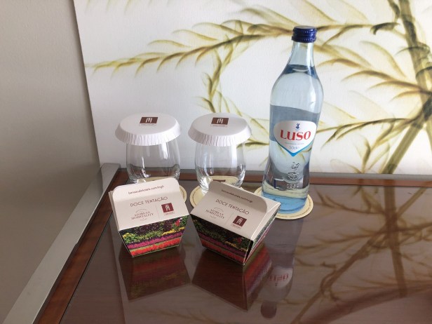 A welcome gift of water and Portuguese cakes. A bottle of water was left each day.