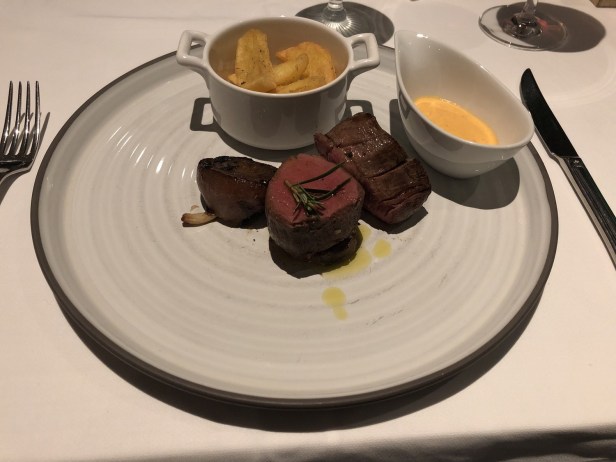 Main on second evening: A very tender steak with a béarnaise sauce – oddly they didn’t have a peppercorn sauce as an option.