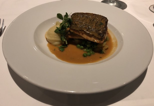 Main on first evening: Forkbeard fish fillets, pomme neuf, pea and mint crush.