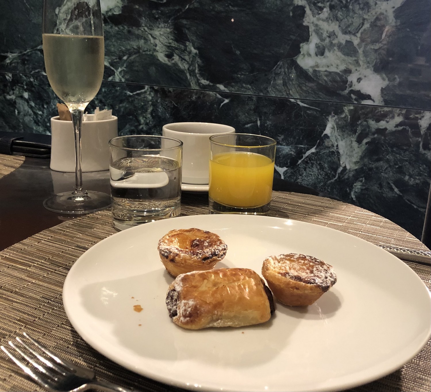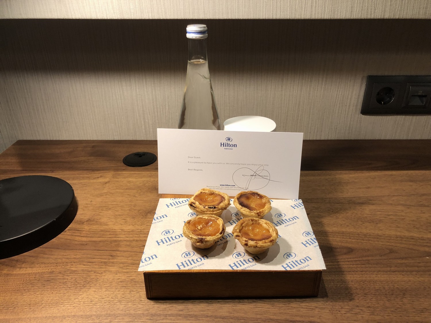 A welcome gift of water and classic Portuguese pasteis de nata (custard puff pastry tarts).