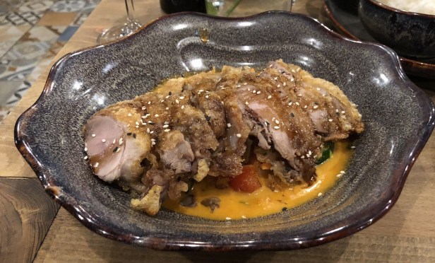 Duck in a red curry sauce with rice 289 Kč – big enough to share.