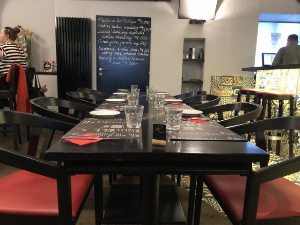 The Spanish wine list is extensive and what’s great is that most are available by 0.1l glass. We chose an excellent Tempranillo reserva tinto for 113 Kč. A 1l carafe of water 45 Kč.