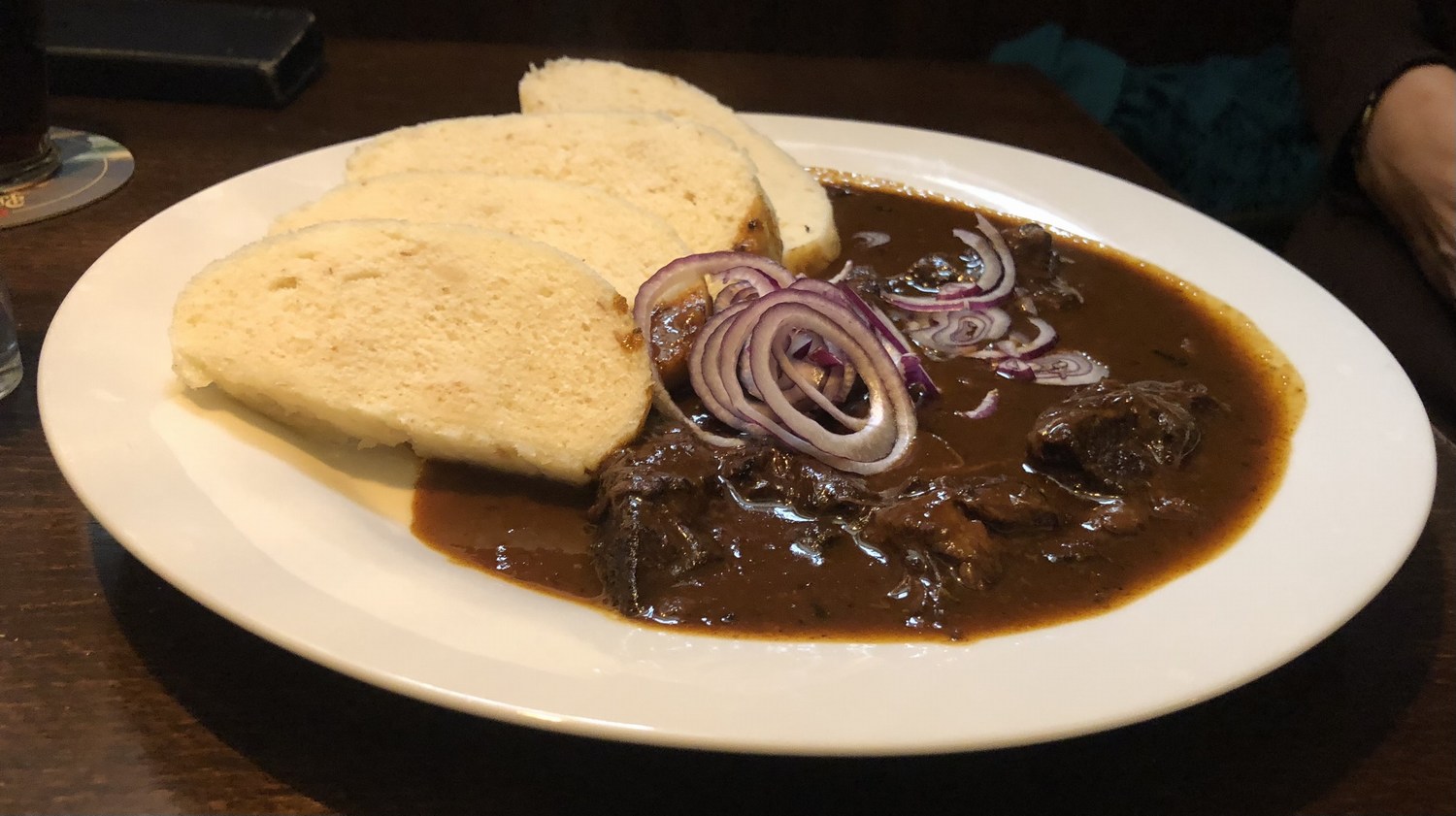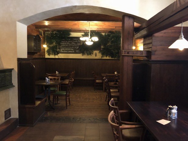 The beef goulash with dumplings was tasty and good value at 170 Kč.